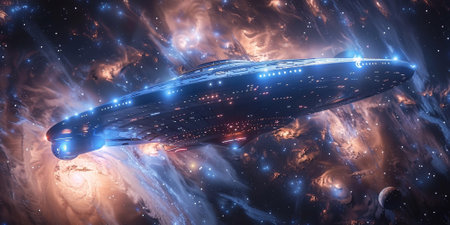 An AI generated illustration of A futuristic spacecraft hovering over a vibrant, star-filled celestial landscape of lush green and blues