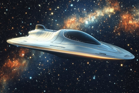 A sleek spaceship travels through a vibrant galaxy filled with stars and cosmic phenomena.