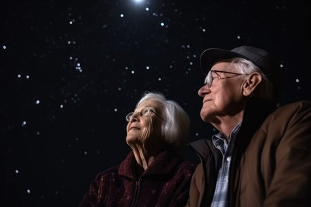 portrait of a senior couple enjoying the stars at night, created with generative ai