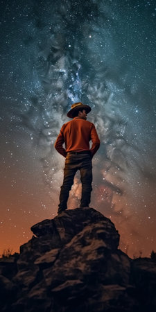 Concept photo of a person gazing up at a starry night sky, with the Milky Way galaxy stretching above them. The vastness of the universe and the persons small presence signify the grandeu
