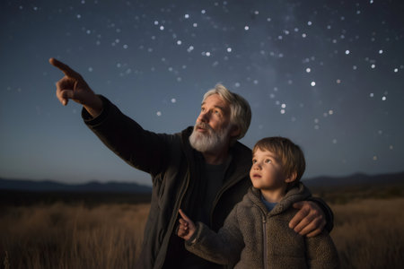 Grandfather pointing at the stars in the night sky with his arm around his grandson, sharing a special moment together