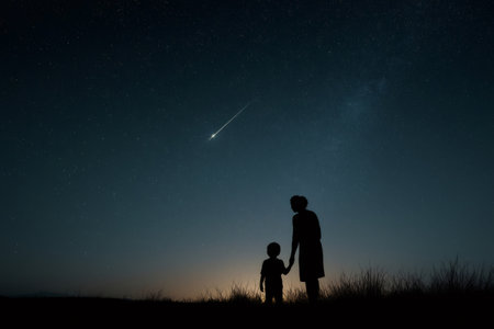 Silhouetted mother and child holding hands, gazing at a shooting star streaking across the night sky filled with twinkling stars