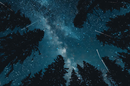 A breathtaking night sky filled with stars and shooting stars shines above a dense forest of tall trees, creating a serene and magical atmosphere.