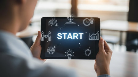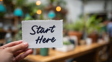 A hand displays a note reading Start Here, symbolizing fresh starts in a cozy setting with plants and gentle lights.