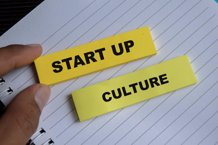 Concept of start up culture write on sticky notes isolated on Wooden Table.