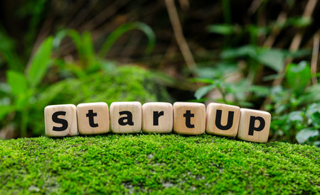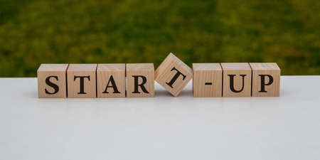 Start-up - word written on wooden blocks on a light table with green background. Business relaunch concept or startup.