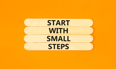 Start with small steps symbol. Concept words phrase Start with small steps on beautiful wooden stick. Beautiful orange paper background. Business Start with small steps concept. Copy space.