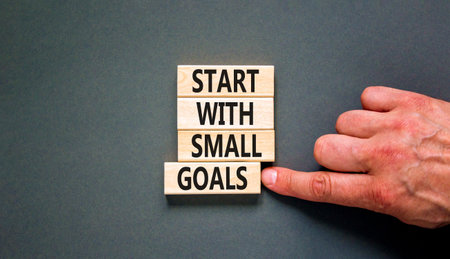 Start with small goals symbol. Concept words phrase Start with small goals on beautiful wooden blocks. Beautiful gray background. Businessman hand. Business Start with small goals concept. Copy space.