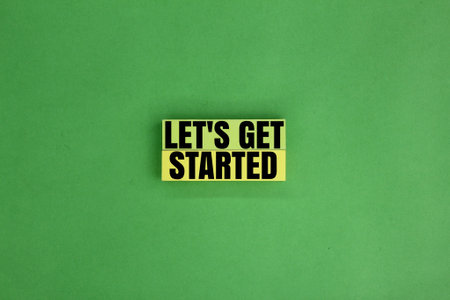 Lets get started symbol. Concept words Lets get started on wooden blocks. Businessman hand. Beautiful gray background with alarm clock. Business and Lets get started concept. Copy space.