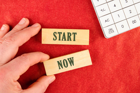 Business and Start now concept. Copy space. Start now symbol on the blocks assembled by hand in a composition with a calculator on a red background, top view