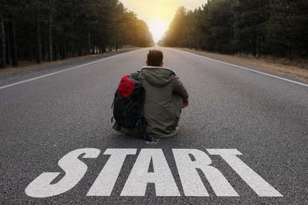 An asphalt road stretches into the distance, marked with a forward-pointing arrow and the word start. The composition features a vibrant sunset casting warm light across the scene. The image suggests concepts of beginnings, direction, and journey. It is suitable for various commercial uses, including motivational and inspirational content.