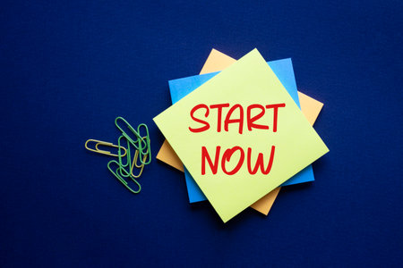 Business motivational quote on a notepaper book - Dream big. Start small. Start now. Flat lay concept with white spiral book, silver pen and green plant on pot on white and yellow table background.