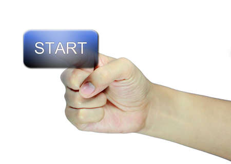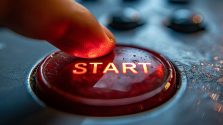 Close-up of a finger pressing an illuminated red Start button, initiating a process or operation with a glowing effect.