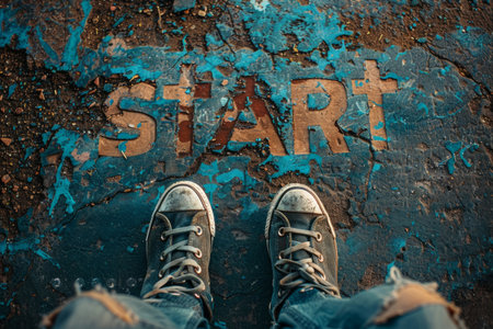 Two white sneakers on asphalt and start concept for business planning, strategy and challenge or career path, opportunity and change.