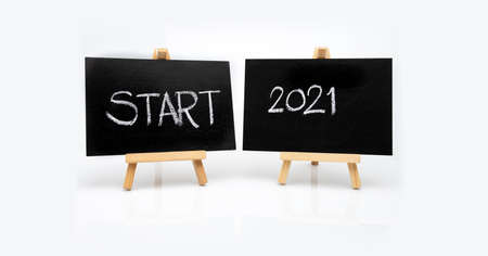 The message START 2021 is written in white chalk on a black chalk board.
