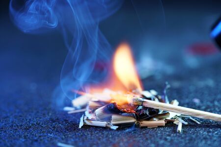 Burning match with blue smoke over black background