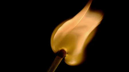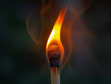 A close-up captures a match igniting, showcasing a bright orange and yellow flame. The wooden matchstick appears charred at the tip, contrasting against the dark backdrop. The composition highlights the fiery glow, suggesting energy and illumination, potentially suitable for editorial and commercial applications.