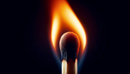 Brightly burning match head glowing in contrast to dark background, representing passion, light, and intensity