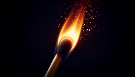 Close-up of burning match head with sparks and smoke against black backdrop, symbolizing fragility, danger, and energy