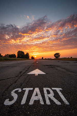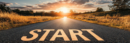 An asphalt road stretches towards a vibrant sunrise, marked with a prominent START sign and an arrow. The composition features a low-angle perspective with the focus on the road. The sky displays a beautiful mix of orange, yellow, and blue hues. The image suggests concepts such as beginnings and progress, suitable for various visual projects.