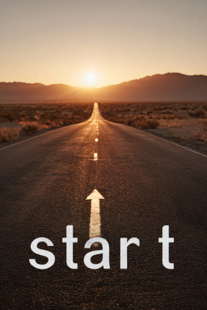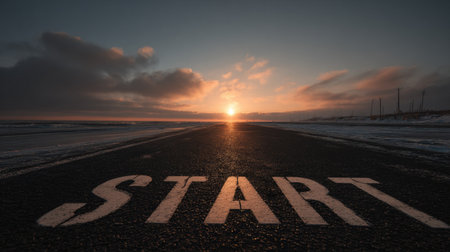 An asphalt road stretches towards a setting sun, marked by wooden letters spelling start, representing fresh opportunities and journeys ahead.