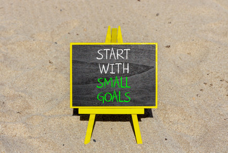 Start with small goals symbol. Concept words phrase Start with small goals on beautiful black blackboard. Beautiful sand beach background. Business Start with small goals concept. Copy space.