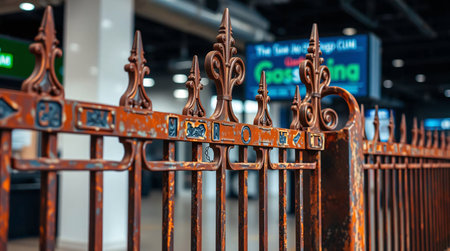 That the image is generated using AI. Rustic iron gate with stock market decline sign in moody urban setting.
