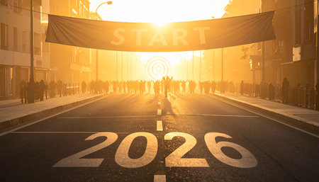 Determined runner at the start line marked START and 2026, symbolizing new goals, ambitions, and success in the new year.