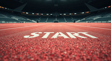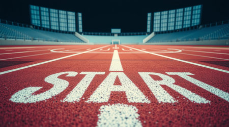 Running track in the stadium with the word Start written on it.