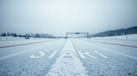 Start written on an asphalt road in the snow. Conceptual image.