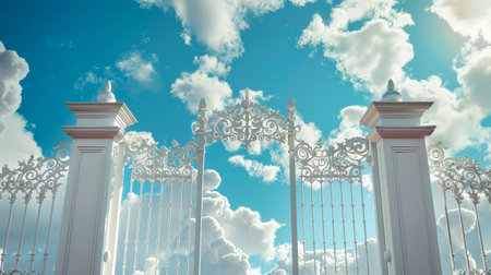 A pair of ornate white gates open to reveal a stunning sky filled with fluffy white clouds. The scene evokes a sense of wonder and possibility.