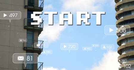 Image of start text and numbers growing over cityscape. global social media, connections and digital interface concept digitally generated image.