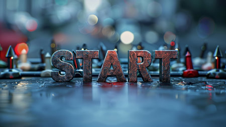 Word Start written on an metal path with legs and boots