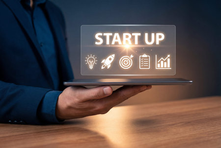 A person holds a tablet displaying a graphic concept of a startup. The image presents a dark, technology-focused scene with bright blue glowing text and graphics. It may be used to illustrate business development, digital innovation, or technology-driven concepts for promotional materials.