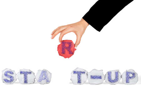 Female hand holding crumbled paper ball with letter and word start-up on isolated white background