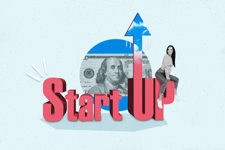 Creative poster banner collage of financier lady sit text inscription start up financial progress concept