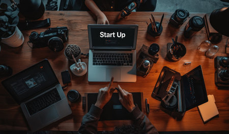 A photo of the text Start Up written on top, several people sitting around an office table with laptops and tablets in their hands, pointing at one spot where they want to have something placed. The word Start Up is clearly visible. On the wooden desk, there is a digital data visualization as the background, representing a business concept and modern interior design, shown from a top view. --ar 17:10 --v 6.1 Job ID: e03a3412-899e-496e-8ff3-a97187c7482b