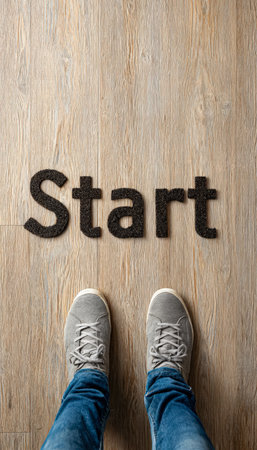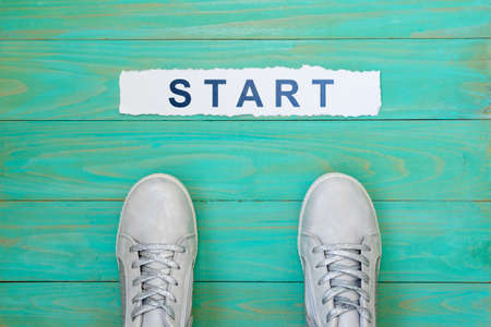Word Start written on an piece of paper with grey shoes on wooden background