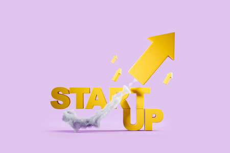 message START UP above a loading bar with office equipment on paper background