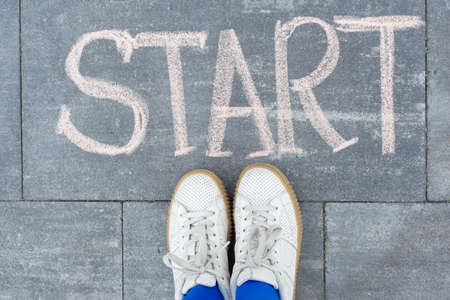 Start concept. Teenager girl standing legs on sidewalk in front of word hand written chalk start. Back to college