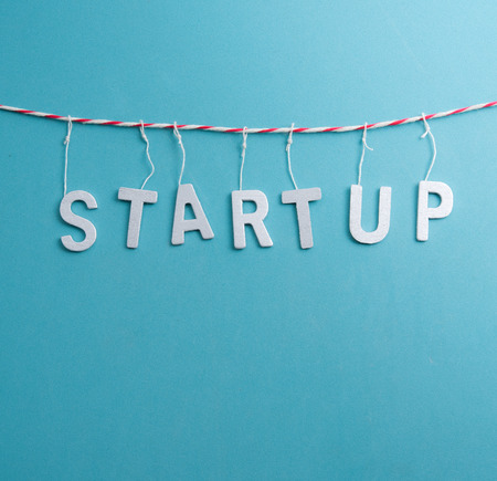 Start up word made by wooden letter on white.