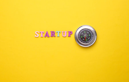 Compass and word startup on yellow background.