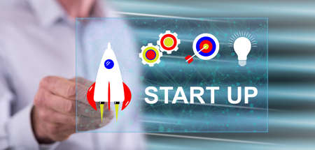 Man touching a start up concept on a touch screen with a pen