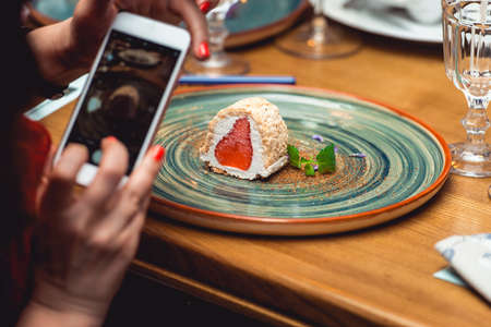 woman taking picture of a delicious creamy dessert with strawberry on a plate in the expensive restaurant. close view