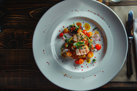 A beautifully arranged plate showcases a gourmet dish with fresh vegetables, including sliced tomatoes and herbs, set in an elegant restaurant atmosphere.