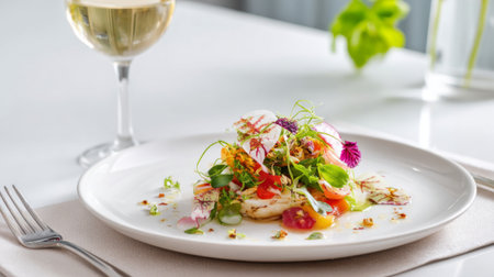 A stunning fine dining dish beautifully arranged with fresh vegetables and delicate herbs, complemented by a glass of wine, perfect for culinary lovers.