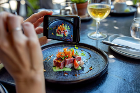 A captivating scene featuring a gourmet dish being photographed, highlighting fresh ingredients and artistic presentation on a wooden table, embodying culinary creativity.