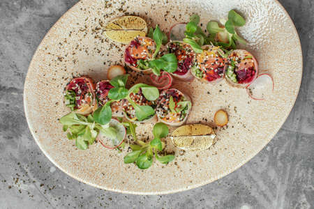 Beautiful and tasty food on a plate, exquisite dish, creative restaurant meal concept, selective focus
