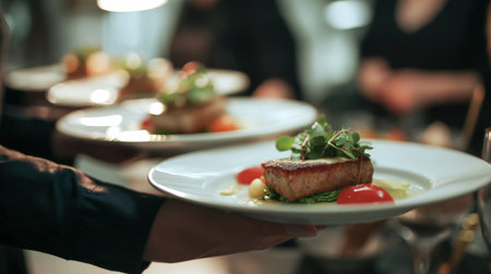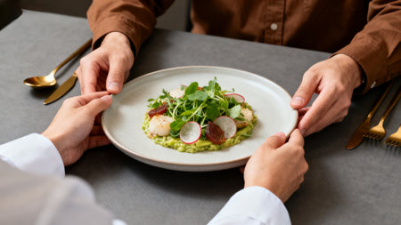 First-person view of waiter serving gourmet dish to eager guests at restaurant