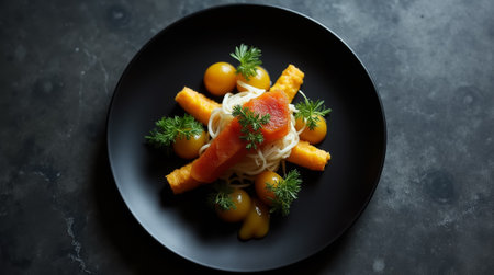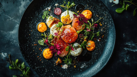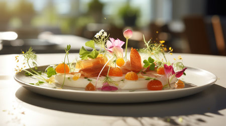 Culinary art is a harmonious combination of fresh ingredients of the highest quality. The elegant fusion showcases the chef's attention to detail. The background is softly blurred, drawing attention to the culinary masterpiece in the foreground.